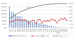 2025 年上半年,江蘇、浙江、廣東建筑業(yè)總產(chǎn)值均超過了1萬億元,分別達(dá)到15455.97億元、11393.61億元和11092.06億元,分別占全國(guó)建筑業(yè)總產(chǎn)值的11.30%、8.33%和8.12%。此外,總產(chǎn)值超過5000億元的還有湖北、山東、福建、四川、湖南、河南、安徽、北京共8個(gè)地區(qū),上述 11 省市完成的建筑業(yè)總產(chǎn)值占全國(guó)建筑業(yè)總產(chǎn)值的70.61%。從各地區(qū)建筑業(yè)總產(chǎn)值增長(zhǎng)情況看,21個(gè)地區(qū)的建筑業(yè)總產(chǎn)值較上年同期都有不同幅度的增長(zhǎng)。其中,海南的增幅最大,達(dá)到了15.79%。寧夏的增幅達(dá)到12.43%。10個(gè)地區(qū)的建筑業(yè)總產(chǎn)值較上年同期出現(xiàn)下降,其中北京、上海、廣西、內(nèi)蒙古的降幅均超過10%(圖 1)。