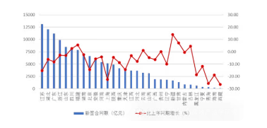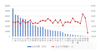 圖 7 2025 年上半年各地區(qū)建筑業(yè)企業(yè)新簽合同額及其增長(zhǎng)情況